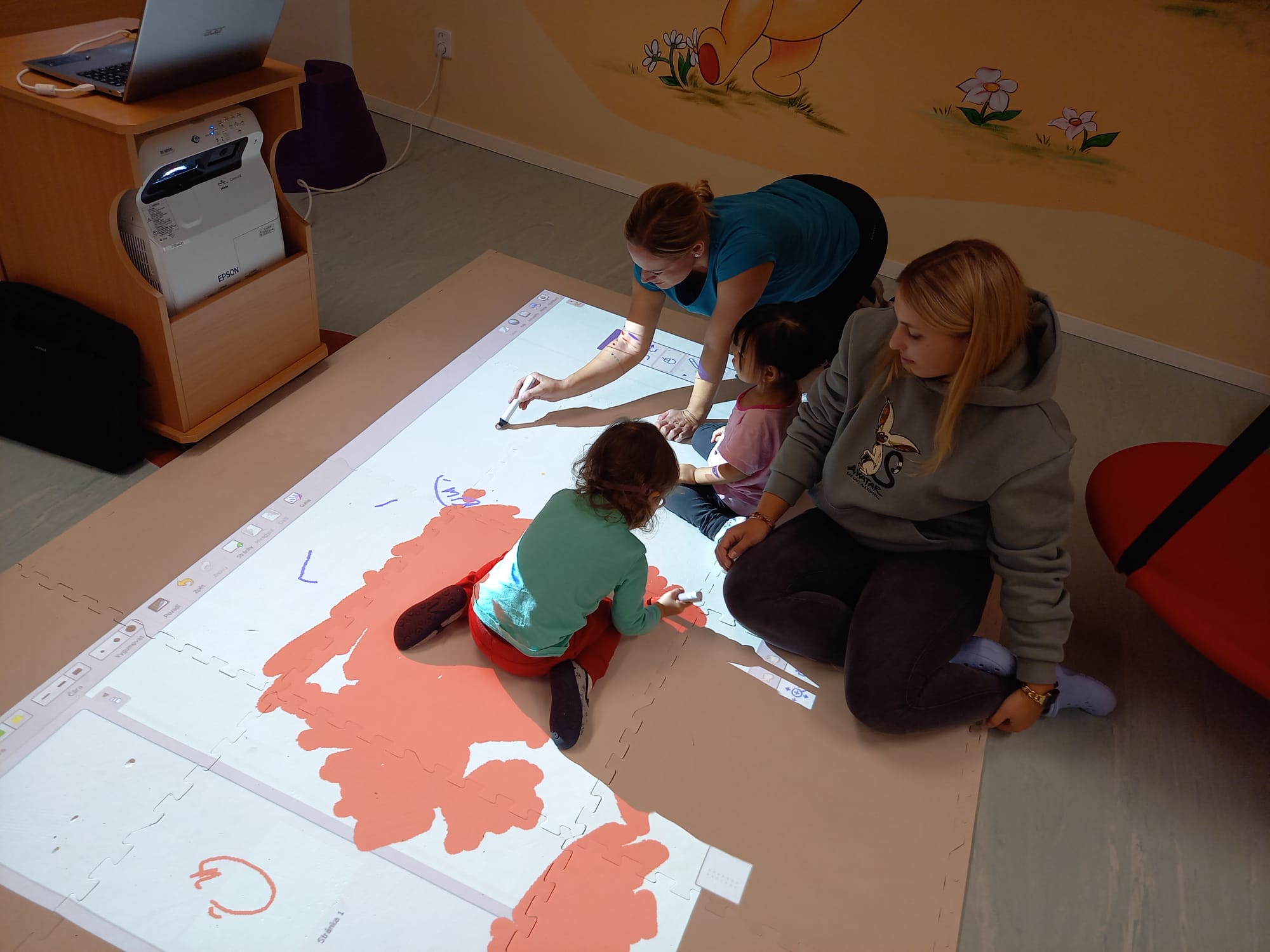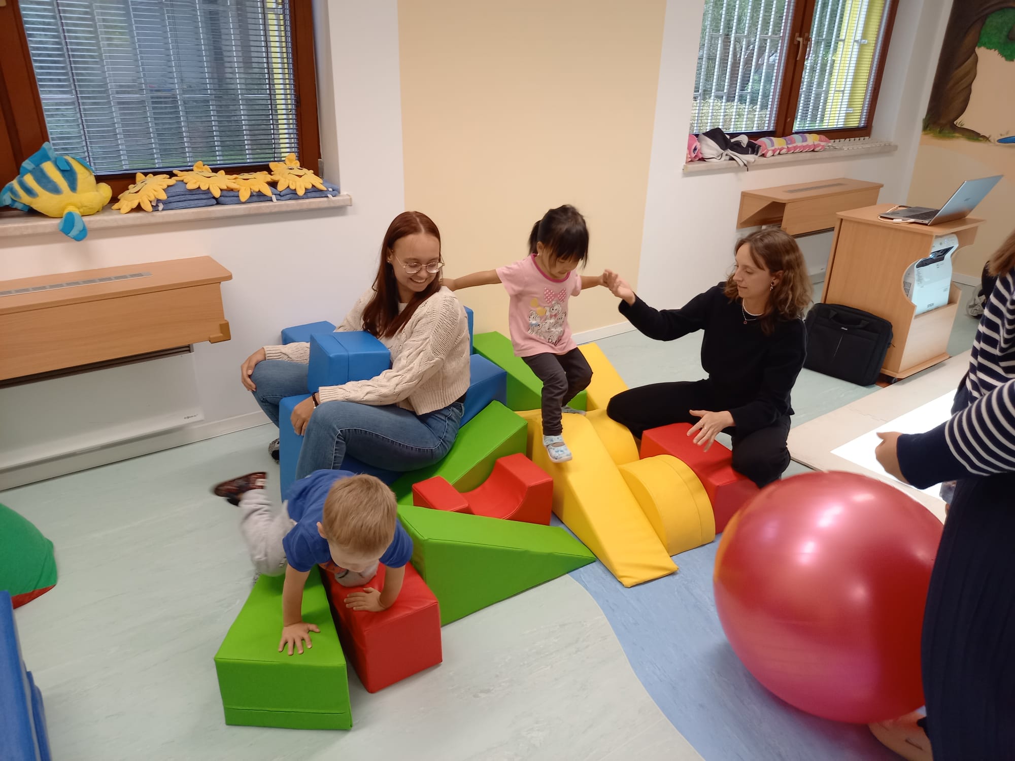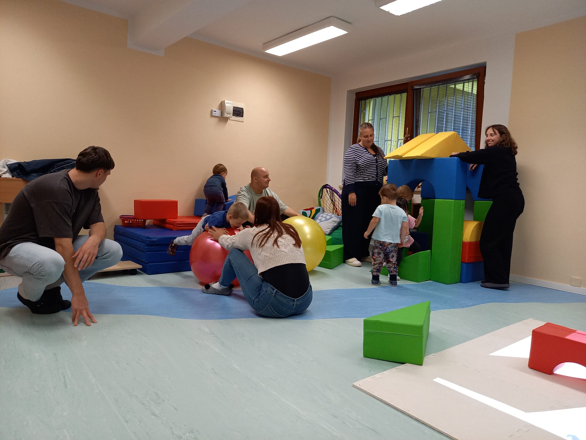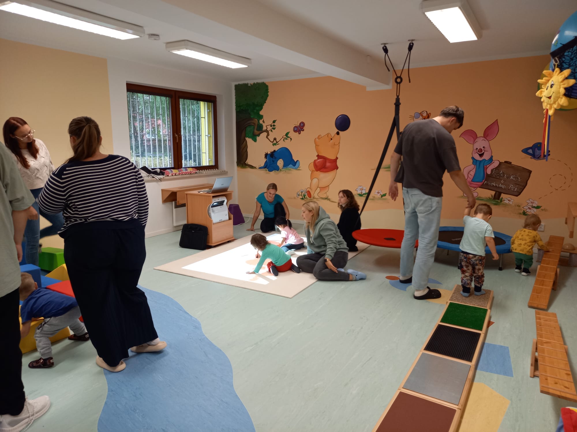 Dětem se velmi líbil také čas s nimi strávený v pohybové místnosti. Děti se tak měly možnost hravou a přirozenou formou opět seznámit s cizími jazyky.